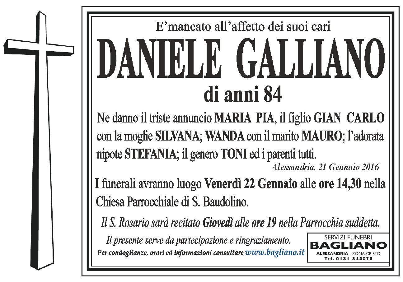 I funerali avranno luogo Venerdì 22 Gennaio alle ore 14,30 nella Chiesa Parrocchiale di S. Baudolino.Il S. Rosario sarà recitato Giovedì alle ore 19 nella Parrocchia suddetta.