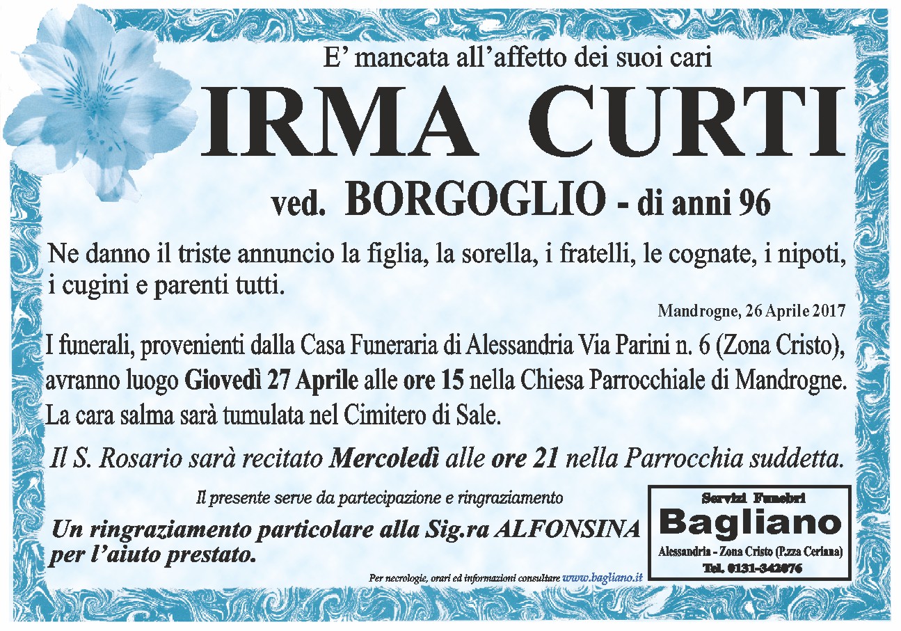 I funerali, provenienti dalla Casa Funeraria di Alessandria Via Parini n. 6 (Zona Cristo), avranno luogo Giovedì 27 Aprile alle ore 15 nella Chiesa Parrocchiale di Mandrogne.La cara salma sarà tumulata nel Cimitero di Sale. Il S. Rosario sarà recitato Mercoledì alle ore 21 nella Parrocchia suddetta.