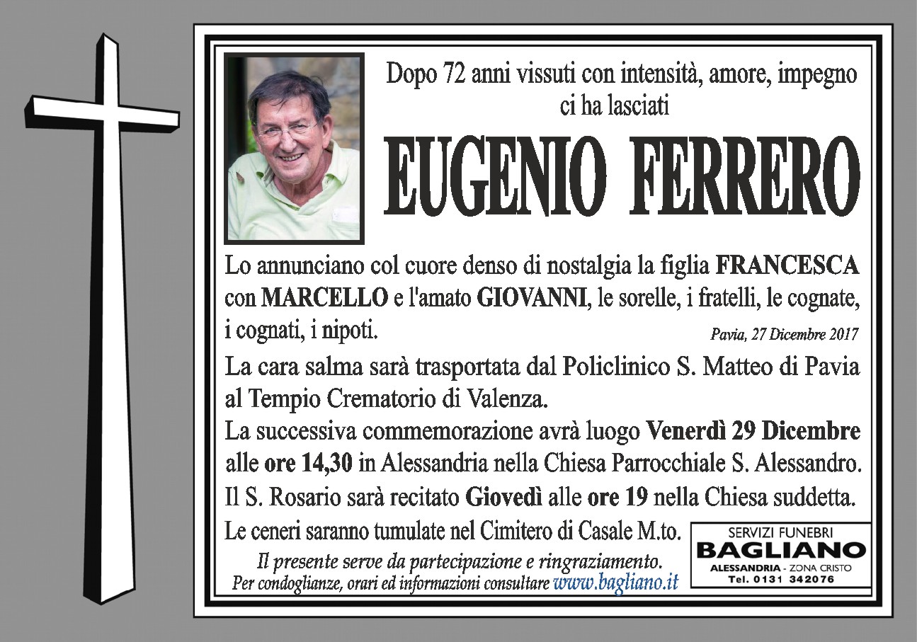 La cara salma sarà trasportata dal Policlinico S. Matteo di Pavia al Tempio Crematorio di Valenza.La successiva commemorazione avrà luogo Venerdì 29 Dicembre alle ore 14,30 in Alessandria nella Chiesa Parrocchiale S. Alessandro.Il S. Rosario sarà recitato Giovedì alle ore 19 nella Chiesa suddetta.Le ceneri saranno tumulate nel Cimitero di Casale M.to.