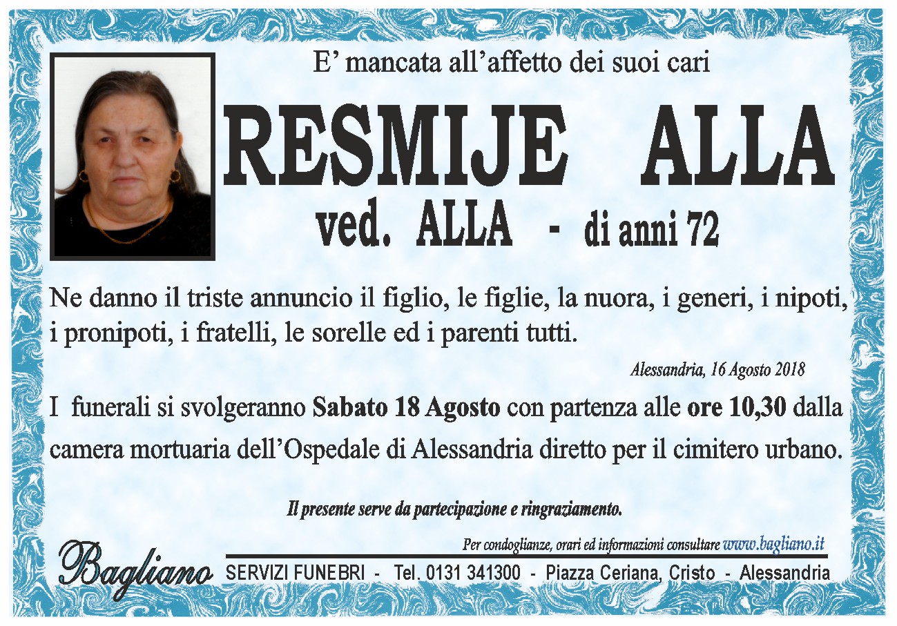 I funerali si svolgeranno Sabato 18 Agosto con partenza alle ore 10,30dalla camera mortuaria dellOspedale di Alessandria diretto per il cimitero urbano.