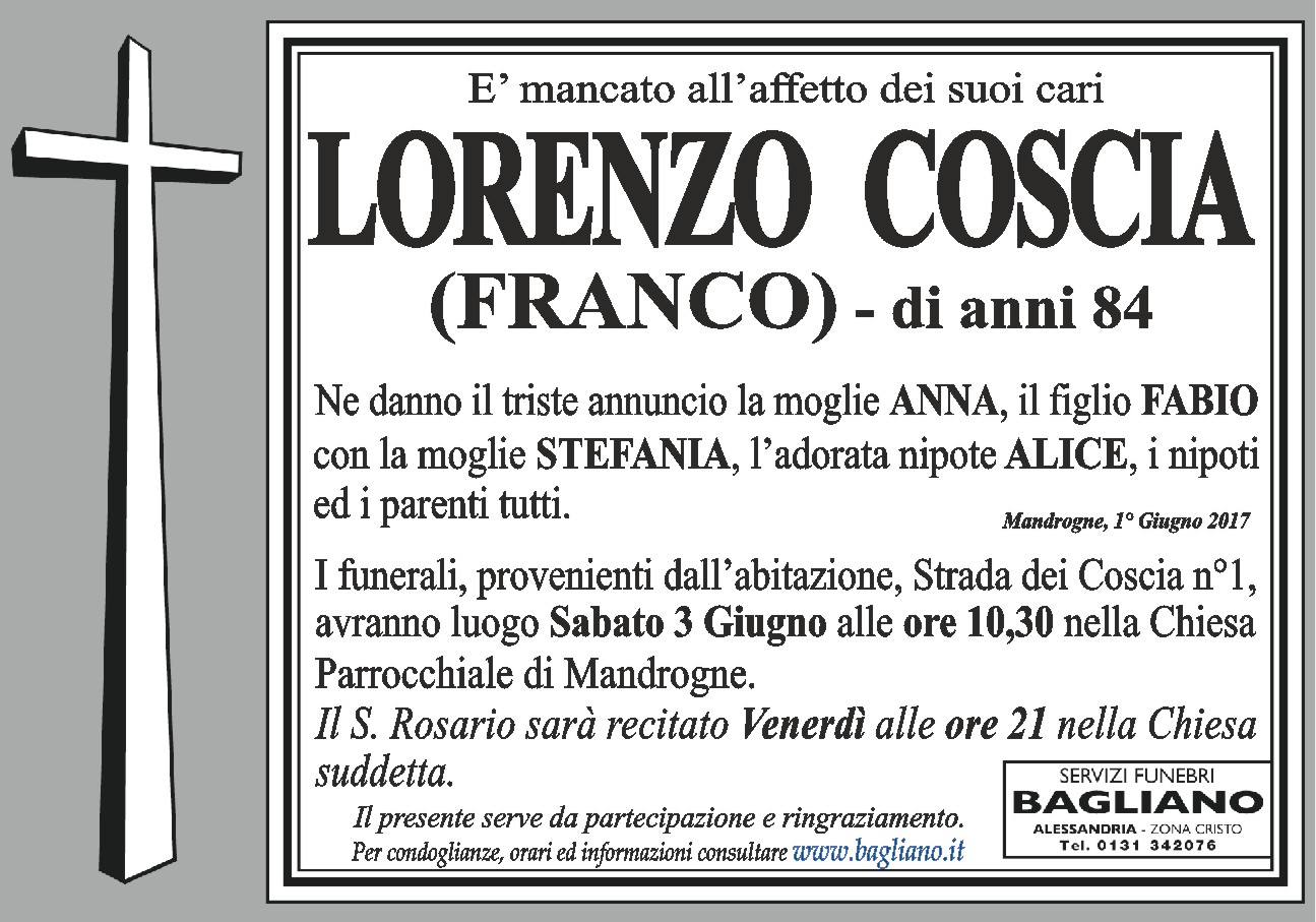 I funerali, provenienti dall'abitazione, Strada dei Coscia n°1, avranno luogo Sabato 3 Giugno alle ore 10,30 nella Chiesa Parrocchiale di Mandrogne.Il S. Rosario sarà recitato Venerdì alle ore 21 nella Chiesa suddetta.