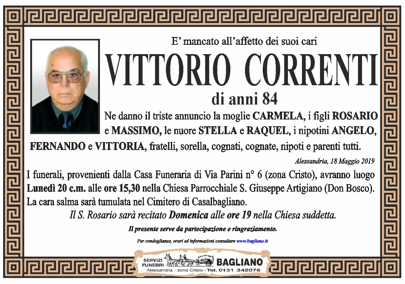 I funerali, provenienti dalla Casa Funeraria di Via Parini n° 6 (zona Cristo), avranno luogo Lunedì 20 c.m. alle ore 15,30 nella Chiesa Parrocchiale S. Giuseppe Artigiano (Don Bosco).La cara salma sarà tumulata nel Cimitero di Casalbagliano.Il S. Rosario sarà recitato Domenica alle ore 19 nella Chiesa suddetta.