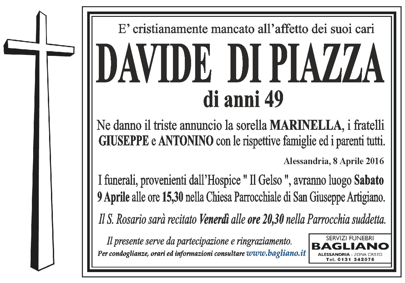 I funerali, provenienti dall'Hospice "Il Gelso", avranno luogo Sabato 9 Aprile alle ore 15,30 nella Chiesa Parrocchiale di San Giuseppe Artigiano.Il S. Rosario sarà recitato Venerdì alle ore 20,30 nella Parrocchia suddetta.