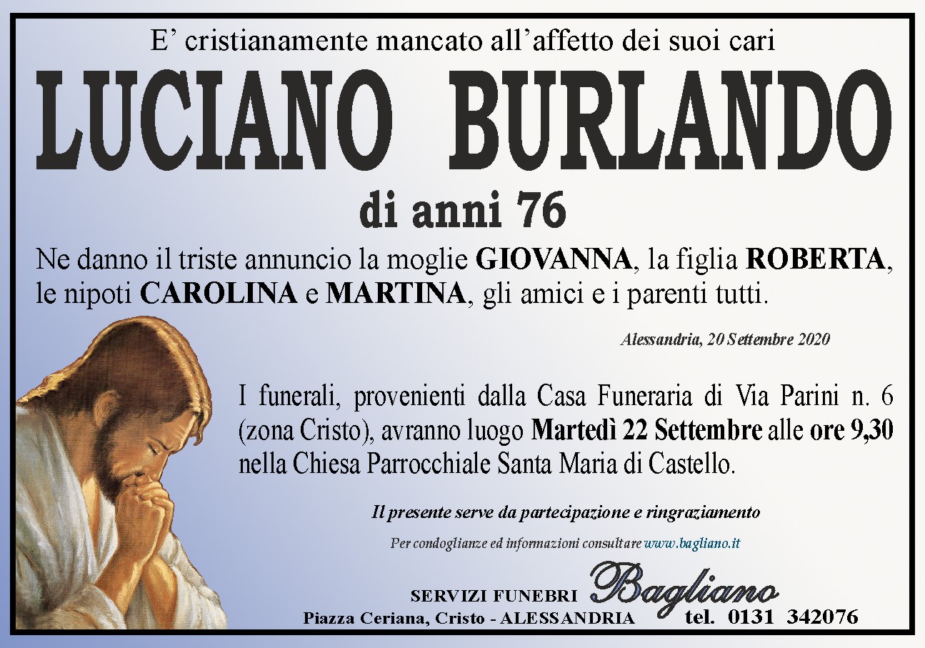 I funerali, provenienti dalla Casa Funeraria di Via Parini n. 6 (zona Cristo), avranno luogo Martedì 22 Settembre alle ore 9,30 nella Chiesa Parrocchiale Santa Maria di Castello.