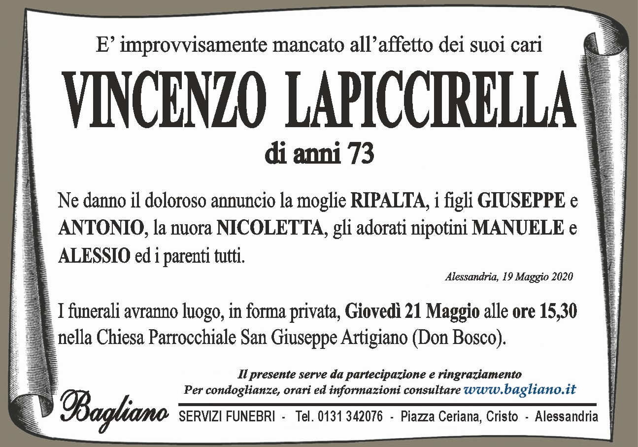 I funerali avranno luogo, in forma privata, Giovedì 21 Maggio alle ore 15,30 nella Chiesa Parrocchiale San Giuseppe Artigiano (Don Bosco).