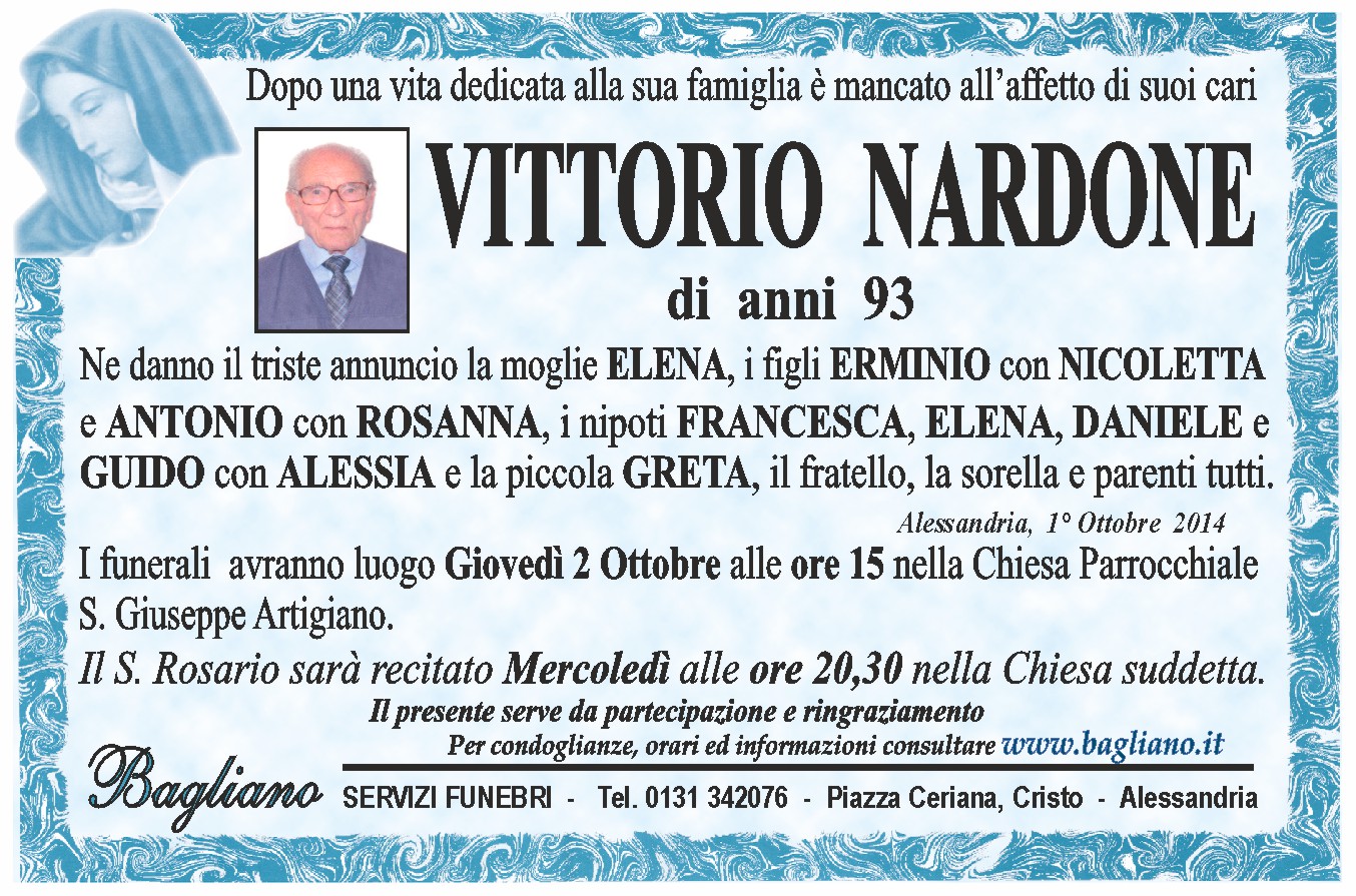 I funerali avranno luogo Giovedì 2 Ottobre alle ore 15 nella Chiesa Parrocchiale S. Giuseppe Artigiano.Il S. Rosario sarà recitato Mercoledì alle ore 20,30 nella Chiesa suddetta.
