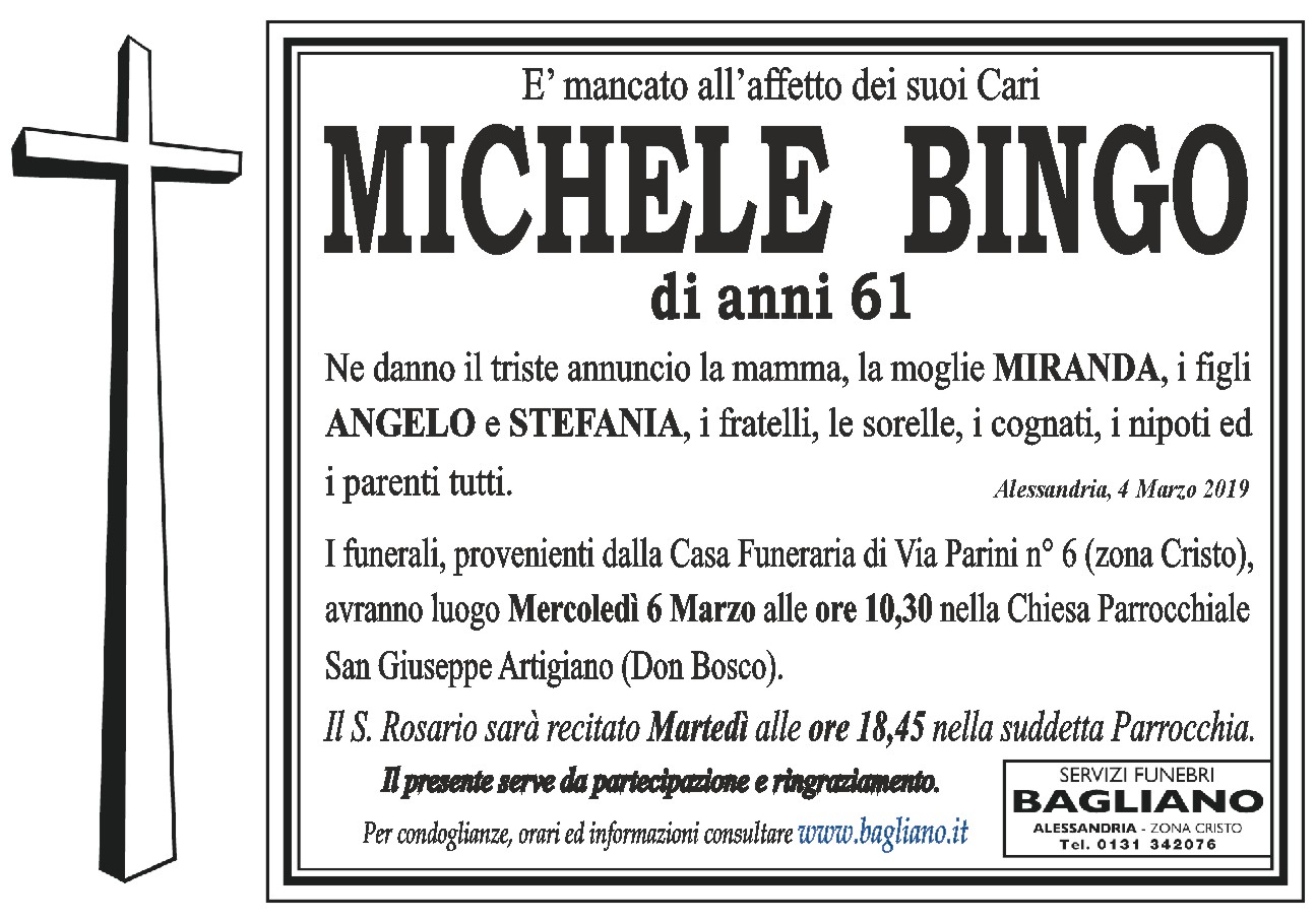 I funerali, provenienti dalla Casa Funeraria di Via Parini n°6 (zona Cristo), avranno luogo Mercoledì 6 Marzo alle ore 10,30 nella Chiesa Parrocchiale San Giuseppe Artigiano (Don Bosco).Il S. Rosario sarà recitato Martedì alle ore 18,45 nella suddetta Parrocchia.