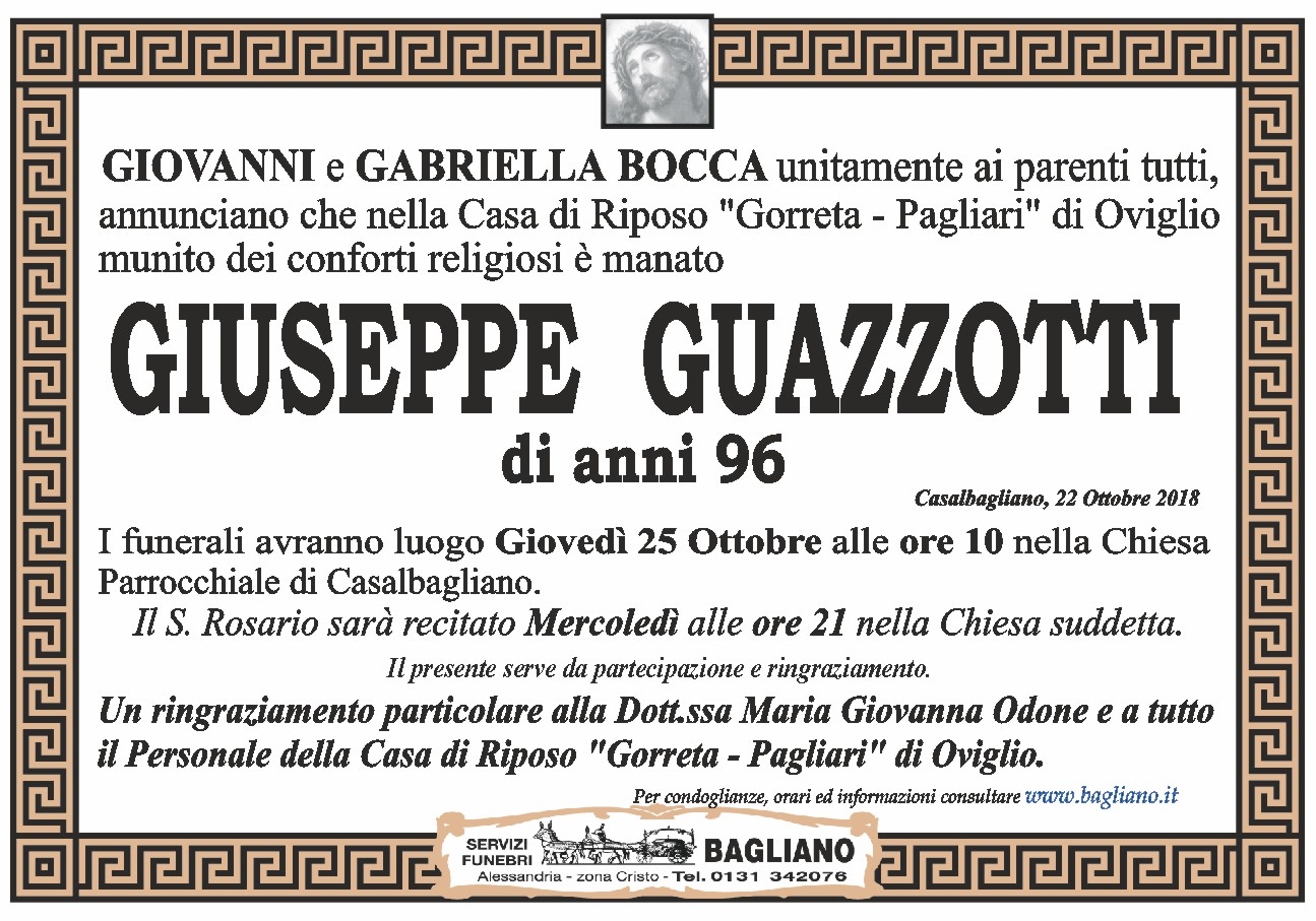 I funerali avranno luogo Giovedì 25 Ottobre alle ore 10 nella Chiesa Parrocchiale di Casalbagliano.Il S. Rosario sarà recitato Mercoledì alle ore 21 nella Chiesa suddetta.