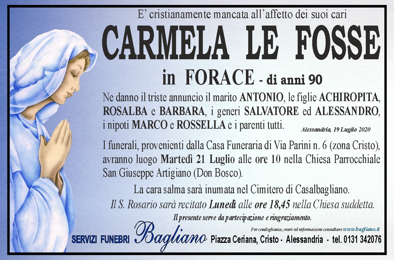I funerali, provenienti dalla Casa Funeraria di Via Parini n. 6 (zona Cristo), avranno luogo Martedì 21 Luglio alle ore 10 nella Chiesa Parrocchiale San Giuseppe Artigiano (Don Bosco).La cara salma sarà inumata nel Cimitero di Casalbagliano.Il S. Rosario sarà recitato Lunedì alle ore 18,45 nella Chiesa suddetta.