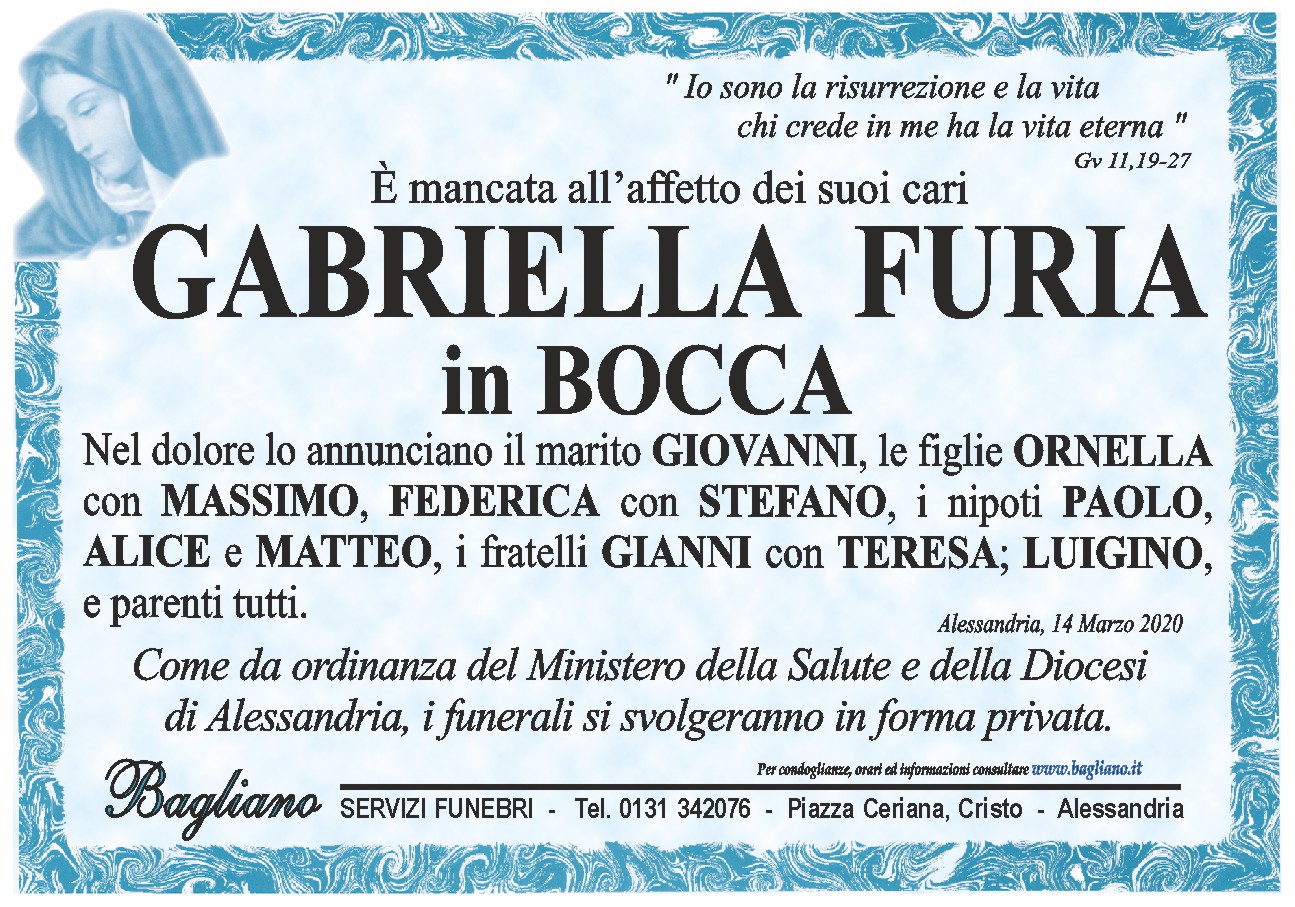 Come da ordinanza del Ministero della Salute e della Diocesi di Alessandria, i funerali si svolgeranno in forma privata.