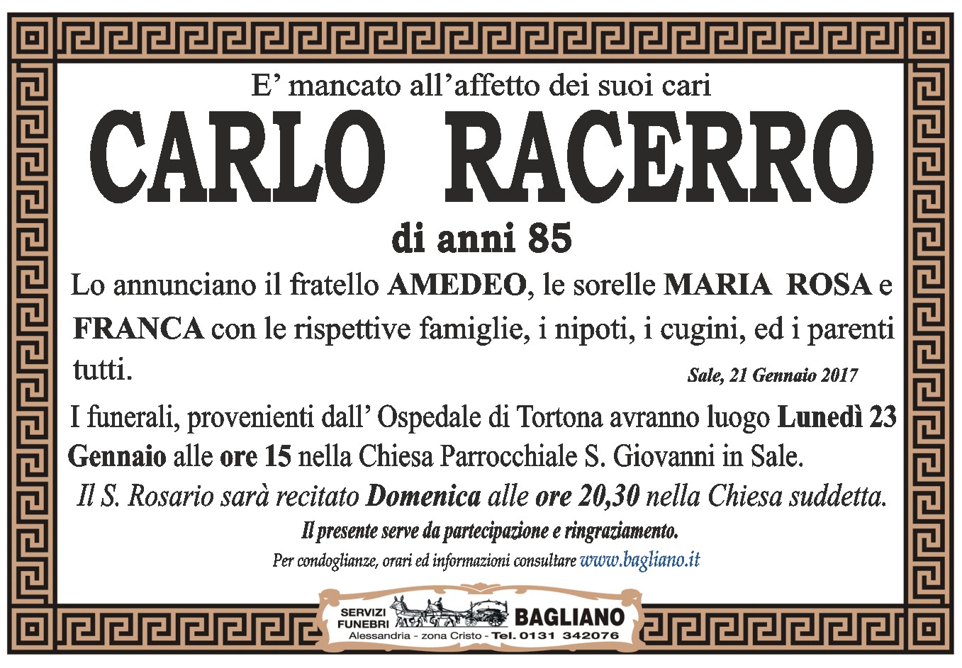I funerali, provenienti dall'Ospedale di Tortona avranno luogo Lunedì 23 Gennaio alle ore 15 nella Chiesa Parrocchiale S. Giovanni in Sale.Il S. Rosario sarà recitato Domenica alle ore 20,30 nella Chiesa suddetta.