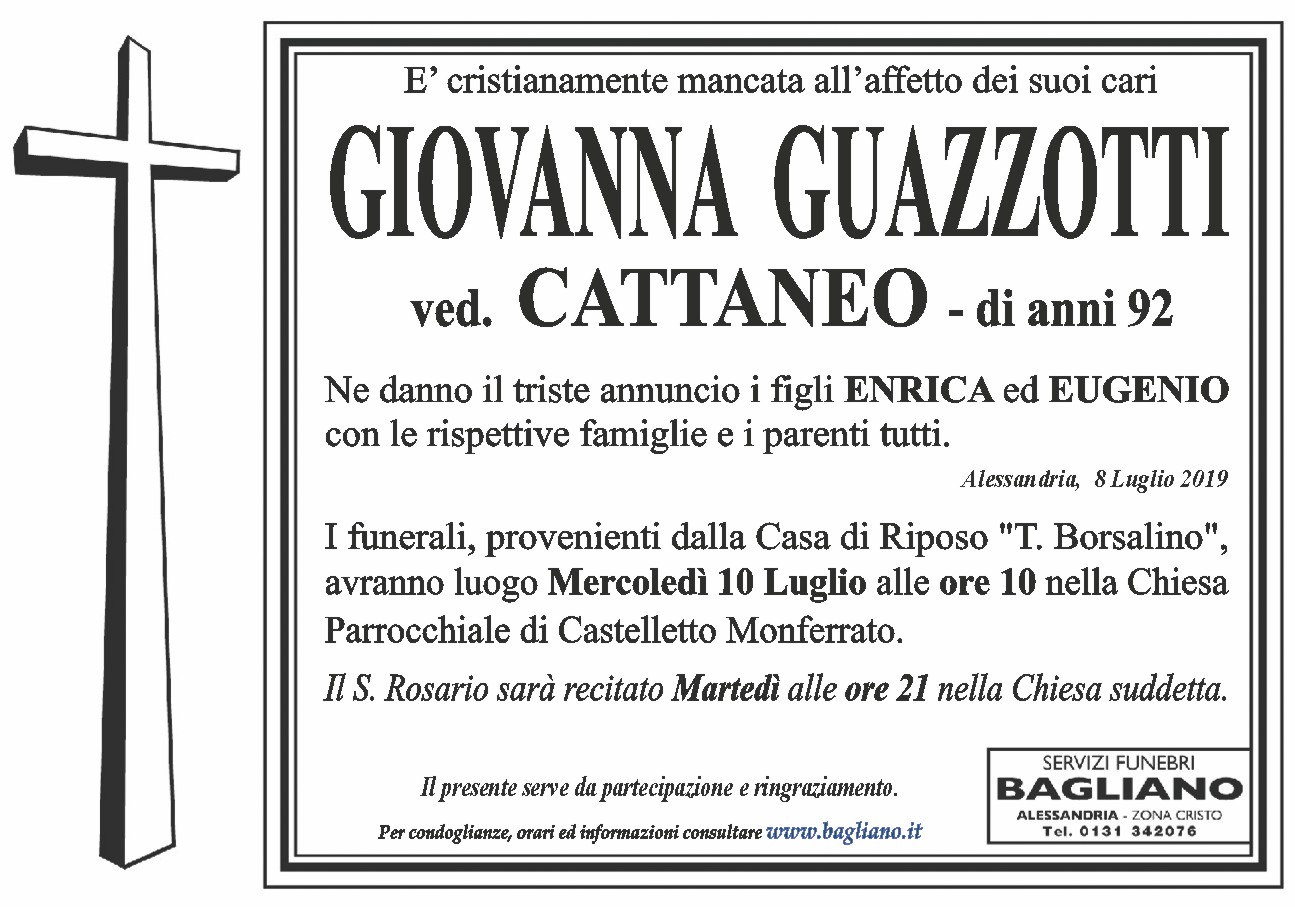 I funerali, provenienti dalla Casa di Riposo "T. Borsalino", avranno luogo Mercoledì 10 Luglio alle ore 10 nella Chiesa Parrocchiale di Castelletto Monferrato.Il S. Rosario sarà recitato Martedì alle ore 21 nella Chiesa suddetta.