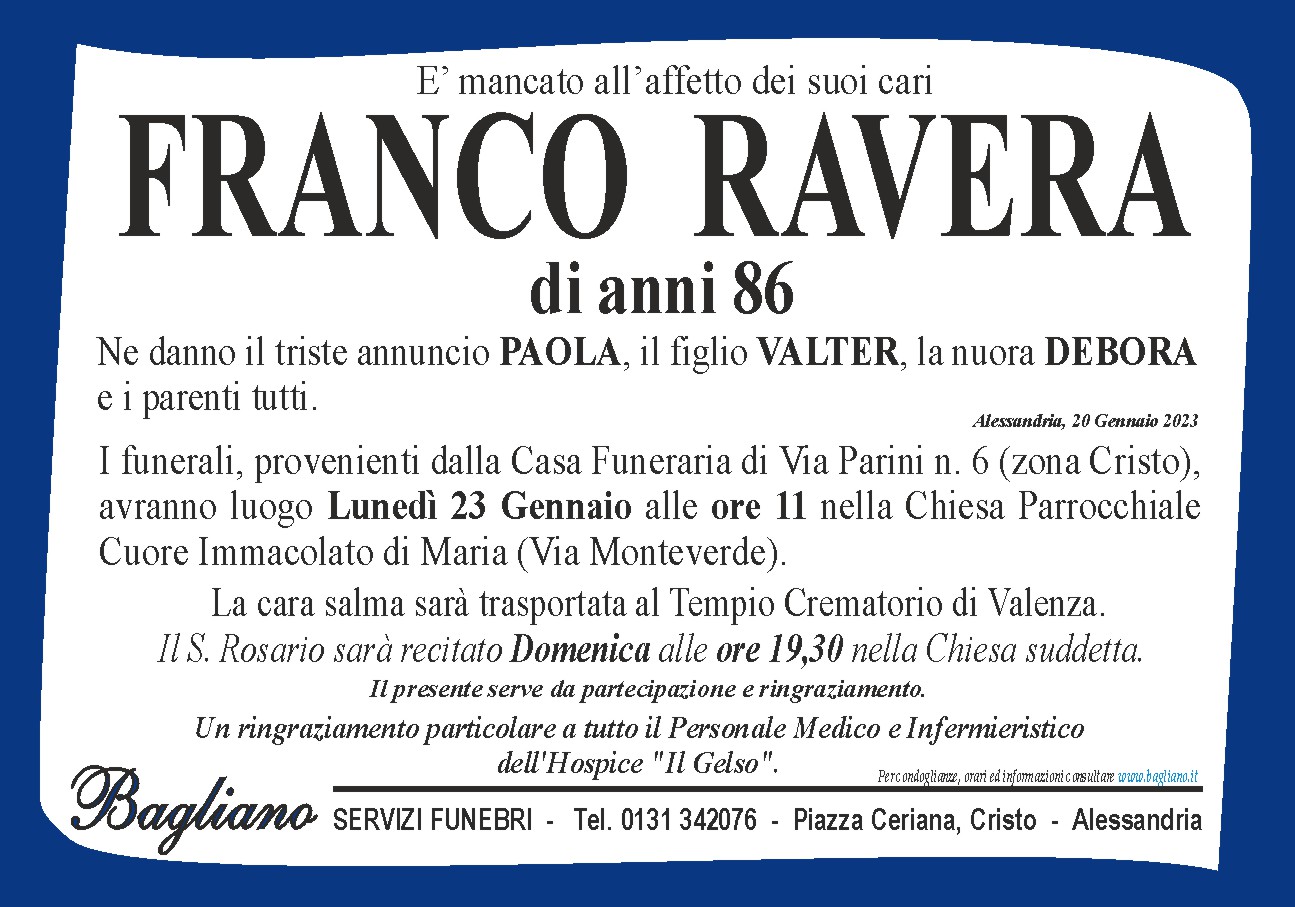 I funerali, provenienti dalla Casa Funeraria di Via Parini n. 6 (zona Cristo),avranno luogo Lunedì 23 Gennaio alle ore 11 nella Chiesa Parrocchiale Cuore Immacolato di Maria (Via Monteverde).La cara salma sarà trasportata al Tempio Crematorio di Valenza.Il S. Rosario sarà recitato Domenica alle ore 19,30 nella Chiesa suddetta.