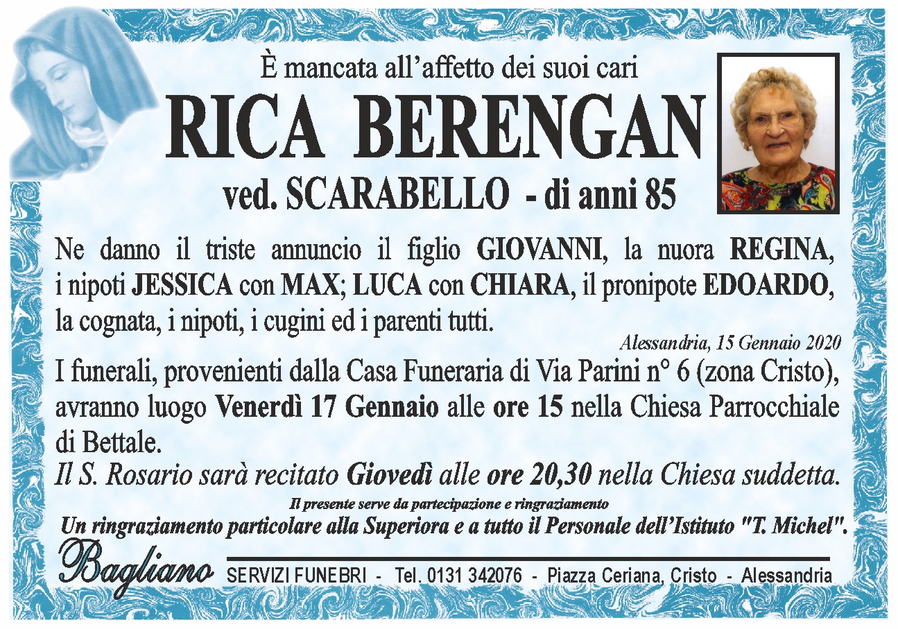 I funerali, provenienti dalla Casa Funeraria di Via Parini n° 6 (zona Cristo), avranno luogo Venerdì 17 Gennaio alle ore 15 nella Chiesa Parrocchiale di Bettale.Il S. Rosario sarà recitato Giovedì alle ore 20,30 nella Chiesa suddetta.
