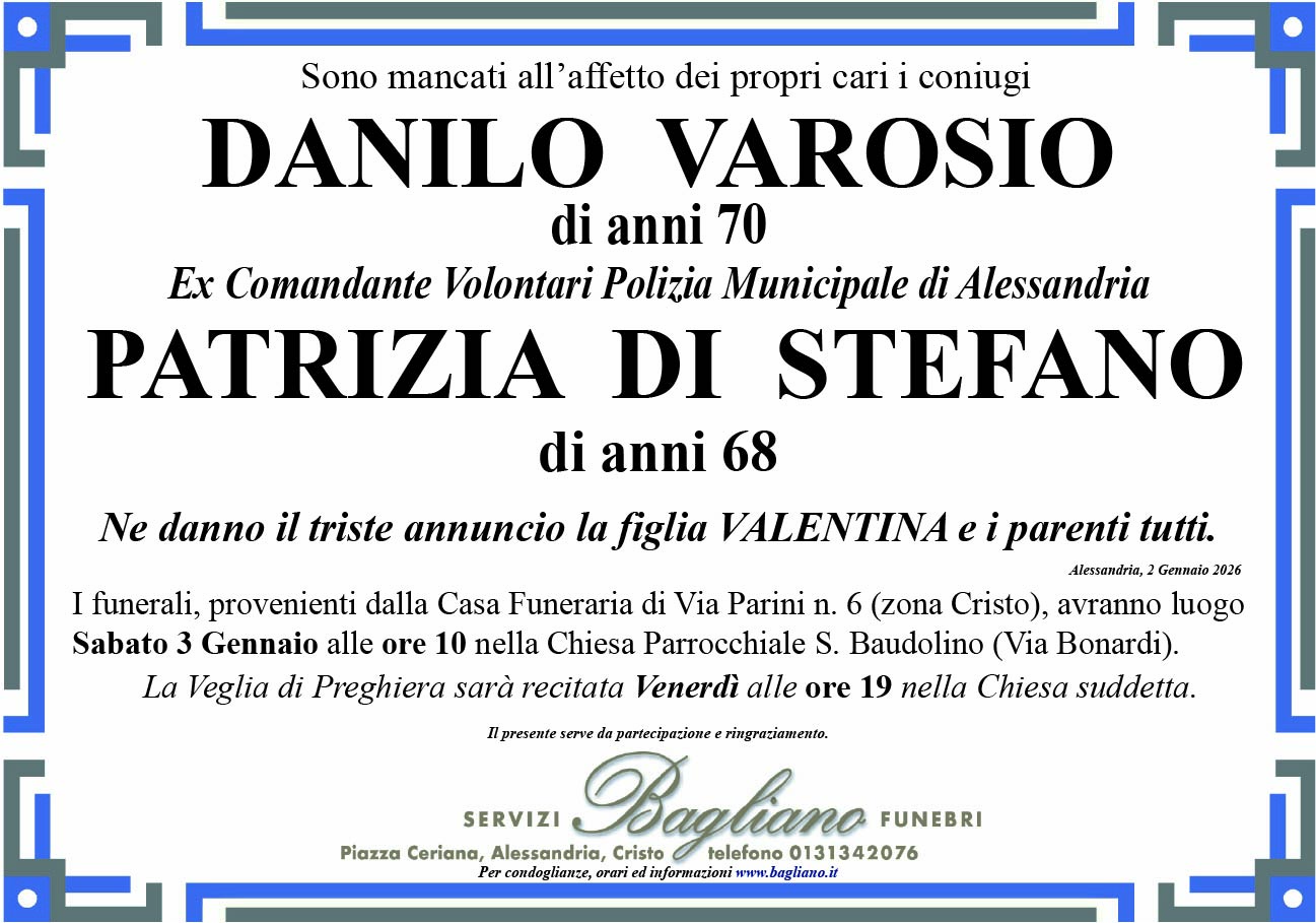 I funerali, provenienti dalla Casa Funeraria di Via Parini n. 6 (zona Cristo), avranno luogo Sabato 3 Gennaio alle ore 10 nella Chiesa Parrocchiale S. Baudolino (Via Bonardi).La Veglia di Preghiera sarà recitata Venerdì alle ore 19 nella Chiesa suddetta.