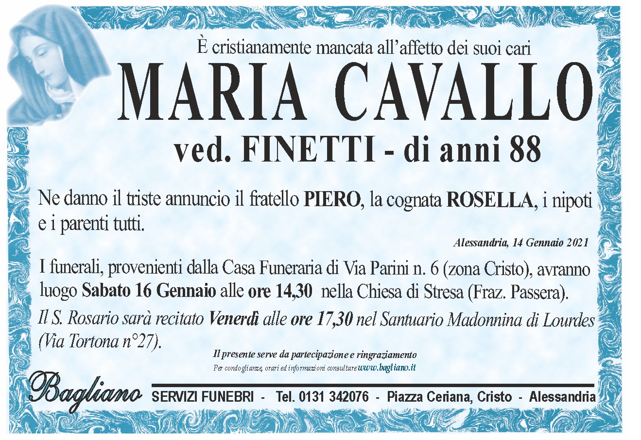 I funerali, provenienti dalla Casa Funeraria di Via Parini n. 6 (zona Cristo), avranno luogo Sabato 16 Gennaio alle ore 14,30 nella Chiesa di Stresa (Fraz. Passera).Il S. Rosario sarà recitato Venerdì alle ore 17,30 nel Santuario Madonnina di Lourdes (Via Tortona n°27).