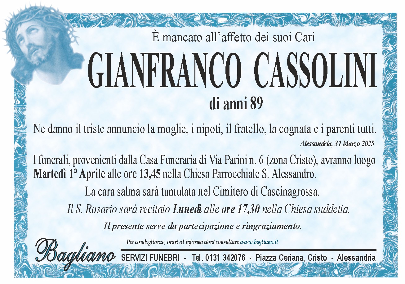 I funerali, provenienti dalla Casa Funeraria di Via Parini n. 6 (zona Cristo), avranno luogo Martedì 1° Aprile alle ore 13,45 nella Chiesa Parrocchiale S. Alessandro.La cara salma sarà tumulata nel Cimitero di Cascinagrossa.Il S. Rosario sarà recitato Lunedì alle ore 17,30 nella Chiesa suddetta.