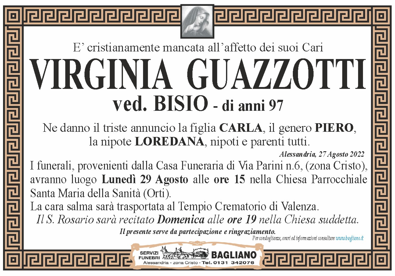 I funerali, provenienti dalla Casa Funeraria di Via Parini n.6, (zona Cristo),avranno luogo Lunedì 29 Agosto alle ore 15 nella Chiesa Parrocchiale Santa Maria della Sanità (Orti).La cara salma sarà trasportata al Tempio Crematorio di Valenza.Il S. Rosario sarà recitato Domenica alle ore 19 nella Chiesa suddetta.