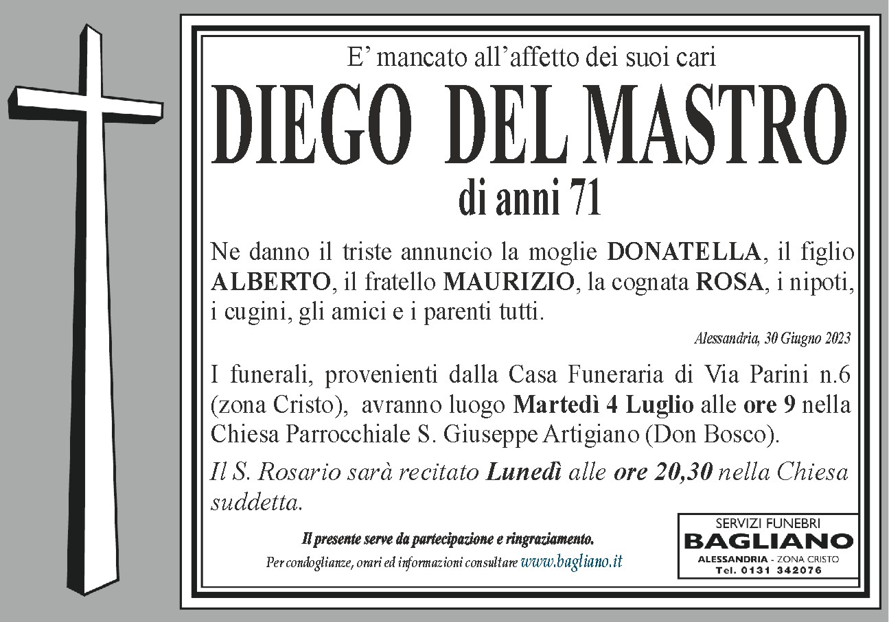 I funerali, provenienti dalla Casa Funeraria di Via Parini n.6(zona Cristo), avranno luogo Martedì 4 Luglio alle ore 9 nella Chiesa Parrocchiale S. Giuseppe Artigiano (Don Bosco).Il S. Rosario sarà recitato Lunedì alle ore 20,30 nella Chiesa suddetta.