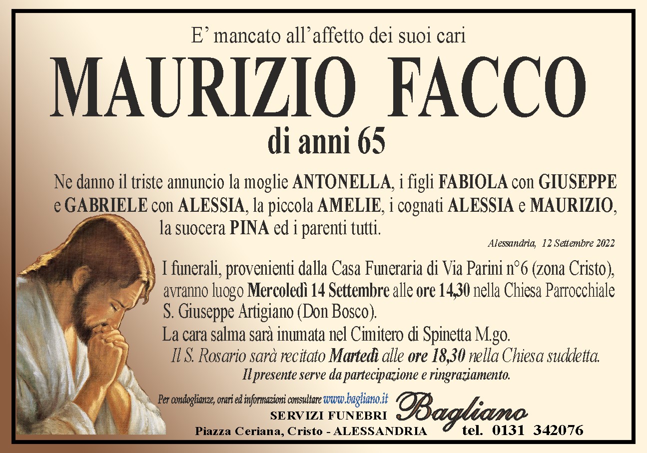 I funerali, provenienti dalla Casa Funeraria di Via Parini n. 6 (zona Cristo), avranno luogo Mercoledì 14 Settembre alle ore 14,30 nella Chiesa Parrocchiale S. Giuseppe Artigiano (Don Bosco).La cara salma sarà inumata nel Cimitero di Spinetta M.go.Il S. Rosario sarà recitato Martedì alle ore 18,30 nella Chiesa suddetta.