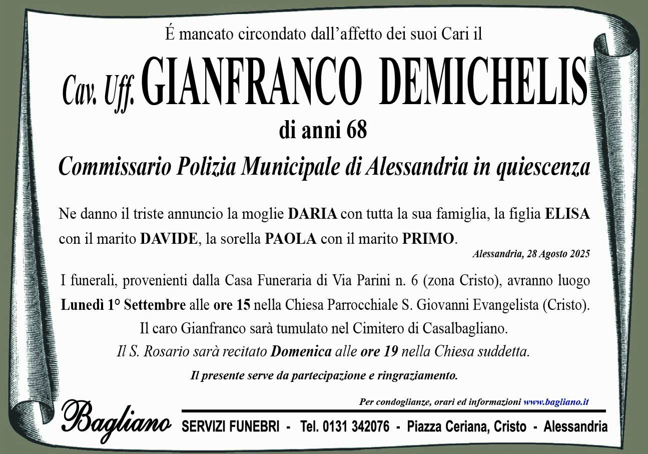 I funerali, provenienti dalla Casa Funeraria di Via Parini n. 6 (zona Cristo), avranno luogo Lunedì 1° Settembre alle ore 15 nella Chiesa Parrocchiale S. Giovanni Evangelista (Cristo).Il S. Rosario sarà recitato Domenica alle ore 19 nella Chiesa suddetta.Il caro Gianfranco sarà tumulato nel Cimitero di Casalbagliano.