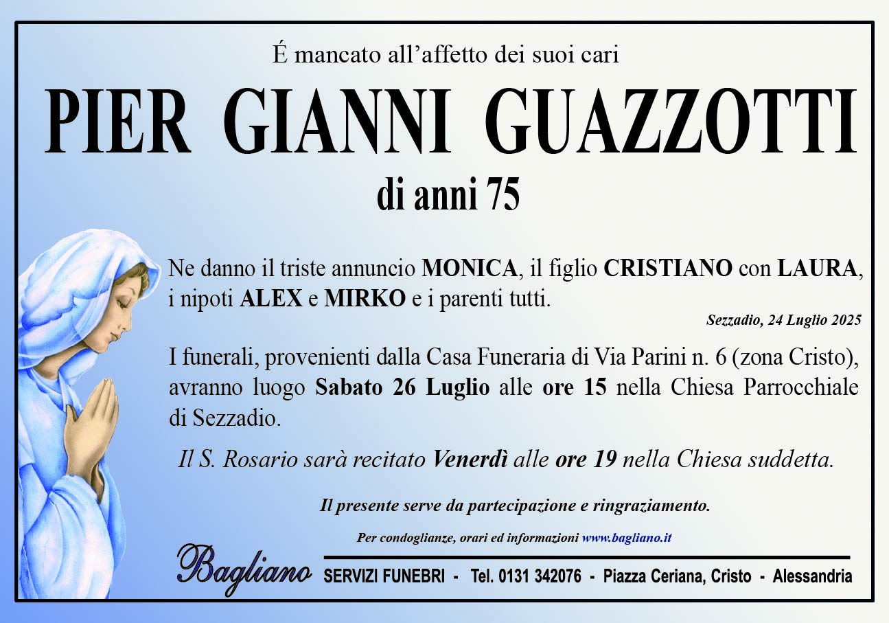 I funerali, provenienti dalla Casa Funeraria di Via Parini n. 6 (zona Cristo), avranno luogo Sabato 26 Luglio alle ore 15 nella Chiesa Parrocchiale di Sezzadio.Il S. Rosario sarà recitato Venerdì alle ore 19 nella Chiesa suddetta.