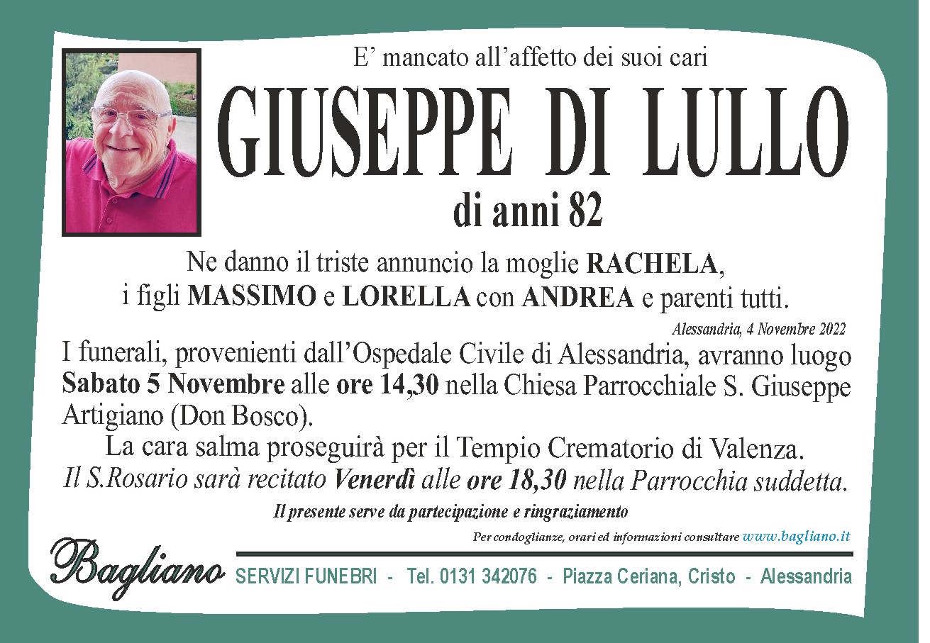 I funerali, provenienti dallOspedale Civile di Alessandria, avranno luogo Sabato 5 Novembre alle ore 14,30 nella Chiesa Parrocchiale S. Giuseppe Artigiano (Don Bosco).Il S. Rosario sarà recitato Venerdì alle ore 18,30 nella Parrocchia suddetta.La cara salma proseguirà per il Tempio Crematorio di Valenza.