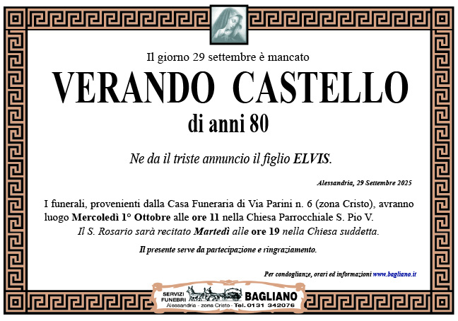 I funerali, provenienti dalla Casa Funeraria di Via Parini n. 6 (zona Cristo), avranno luogo Mercoledì 1° Ottobre alle ore 11 nella Chiesa Parrocchiale S. Pio V.Il S. Rosario sarà recitato Martedì alle ore 19 nella Chiesa suddetta.