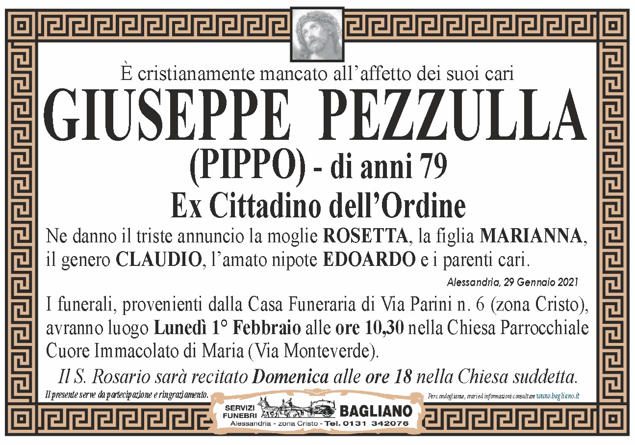 I funerali, provenienti dalla Casa Funeraria di Via Parini n. 6 (zona Cristo), avranno luogo Lunedì 1° Febbraio alle ore 10,30 nella Chiesa Parrocchiale Cuore Immacolato di Maria (Via Monteverde).Il S. Rosario sarà recitato Domenica alle ore 18 nella Chiesa suddetta.