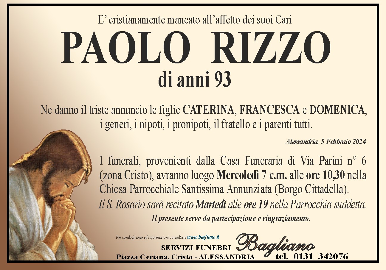 I funerali, provenienti dalla Casa Funeraria di Via Parini n° 6(zona Cristo), avranno luogo Mercoledì 7 c.m. alle ore 10,30 nella Chiesa Parrocchiale Santissima Annunziata (Borgo Cittadella).Il S. Rosario sarà recitato Martedì alle ore 19 nella Parrocchia suddetta.