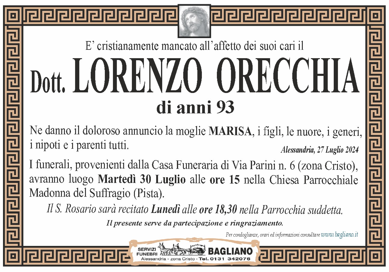 I funerali, provenienti dalla Casa Funeraria di Via Parini n. 6 (zona Cristo), avranno luogo Martedì 30 Luglio alle ore 15 nella Chiesa Parrocchiale Madonna del Suffragio (Pista).Il S. Rosario sarà recitato Lunedì alle ore 18,30 nella Parrocchia suddetta.