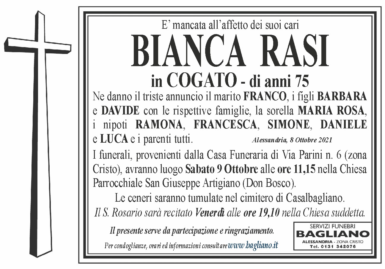 I funerali, provenienti dalla Casa Funeraria di Via Parini n. 6 (zona Cristo), avranno luogo Sabato 9 Ottobre alle ore 11,15 nella Chiesa Parrocchiale San Giuseppe Artigiano (Don Bosco).Le ceneri saranno tumulate nel cimitero di Casalbagliano.Il S. Rosario sarà recitato Venerdì alle ore 19,10 nella Chiesa suddetta.