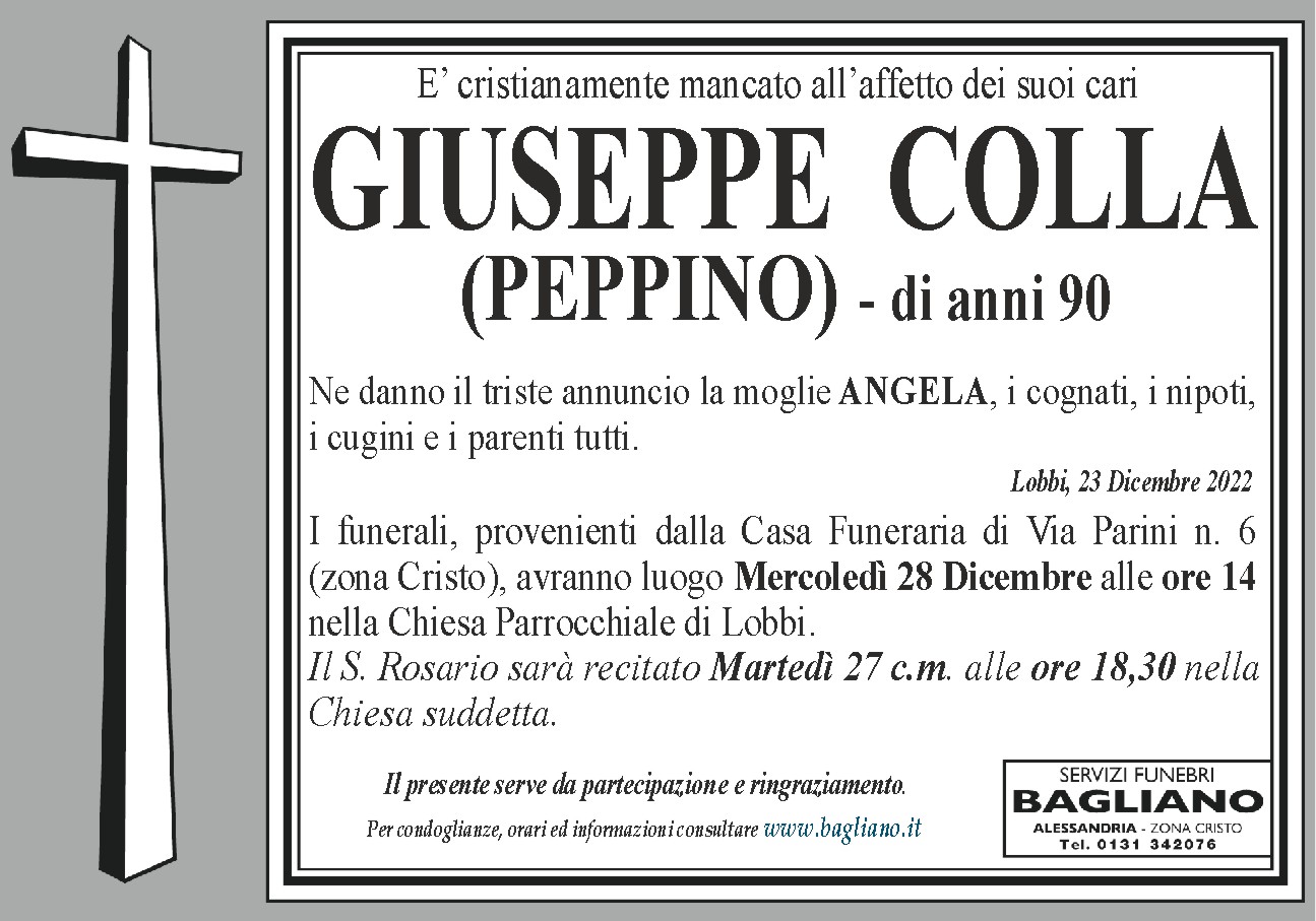 I funerali, provenienti dalla Casa Funeraria di Via Parini n. 6(zona Cristo), avranno luogo Mercoledì 28 Dicembre alle ore 14 nella Chiesa Parrocchiale di Lobbi.Il S. Rosario sarà recitato Martedì 27 c.m. alle ore 18,30 nella Chiesa suddetta.