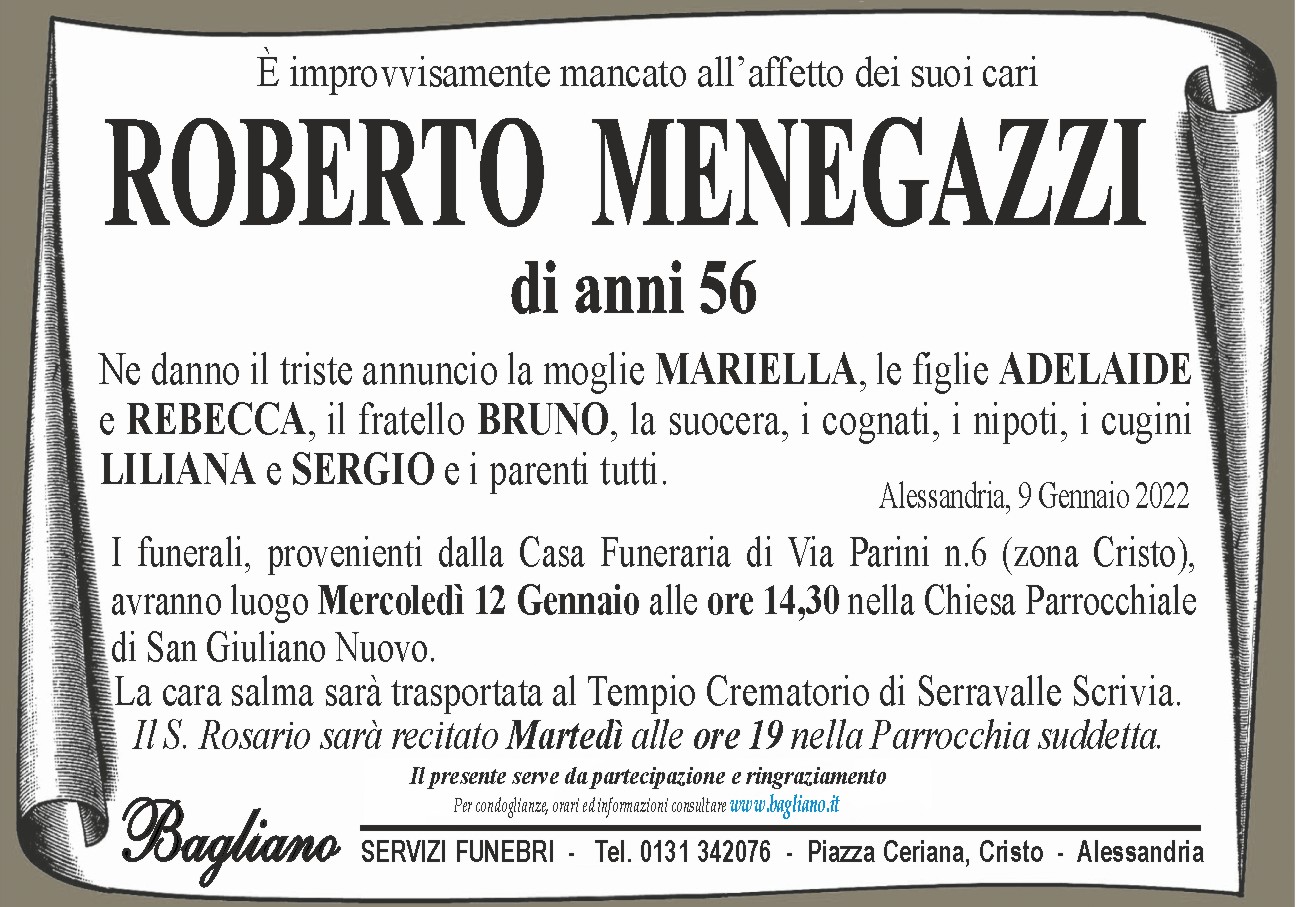 I funerali, provenienti dalla Casa Funeraria di Via Parini n.6 (zona Cristo), avranno luogo Mercoledì 12 Gennaio alle ore 14,30 nella Chiesa Parrocchiale di San Giuliano Nuovo.La cara salma sarà trasportata al Tempio Crematorio di Serravalle Scrivia.Il S. Rosario sarà recitato Martedì alle ore 19 nella Parrocchia suddetta.