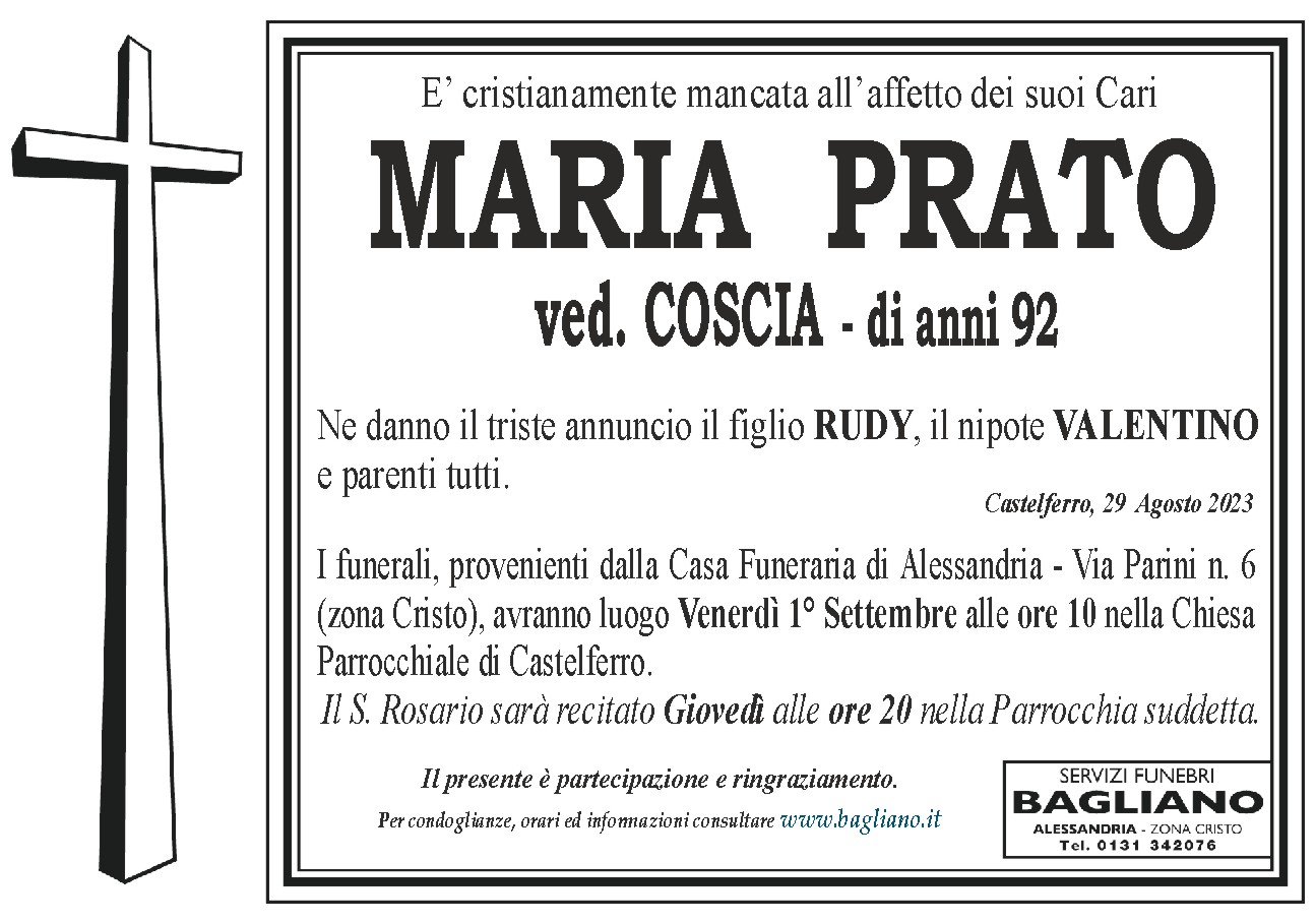 I funerali, provenienti dalla Casa Funeraria di Alessandria - Via Parini n. 6(zona Cristo), avranno luogo Venerdì 1° Settembre alle ore 10 nella ChiesaParrocchiale di Castelferro.Il S. Rosario sarà recitato Giovedì alle ore 20 nella Parrocchia suddetta.