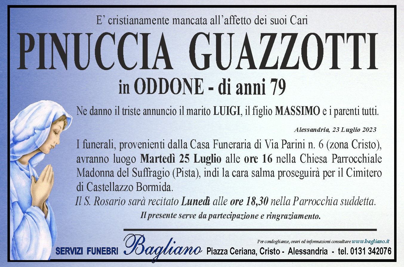 I funerali, provenienti dalla Casa Funeraria di Via Parini n. 6 (zona Cristo),avranno luogo Martedì 25 Luglio alle ore 16 nella Chiesa ParrocchialeMadonna del Suffragio (Pista), indi la cara salma proseguirà per il Cimiterodi Castellazzo Bormida.Il S. Rosario sarà recitato Lunedì alle ore 18,30 nella Parrocchia suddetta.