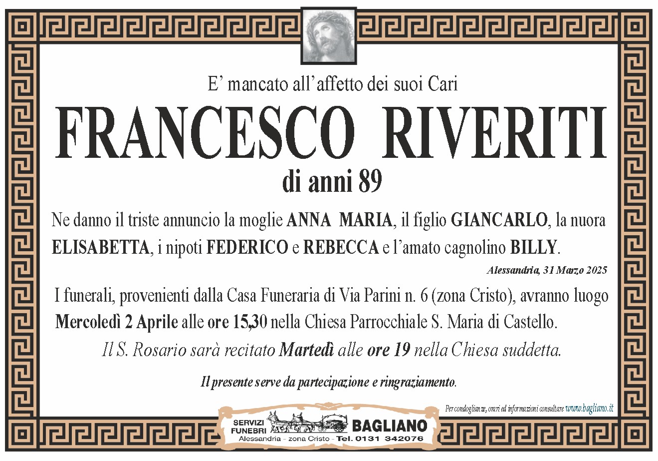 I funerali, provenienti dalla Casa Funeraria di Via Parini n. 6 (zona Cristo), avranno luogoMercoledì 2 Aprile alle ore 15,30 nella Chiesa Parrocchiale S. Maria di Castello.Il S. Rosario sarà recitato Martedì alle ore 19 nella Chiesa suddetta.