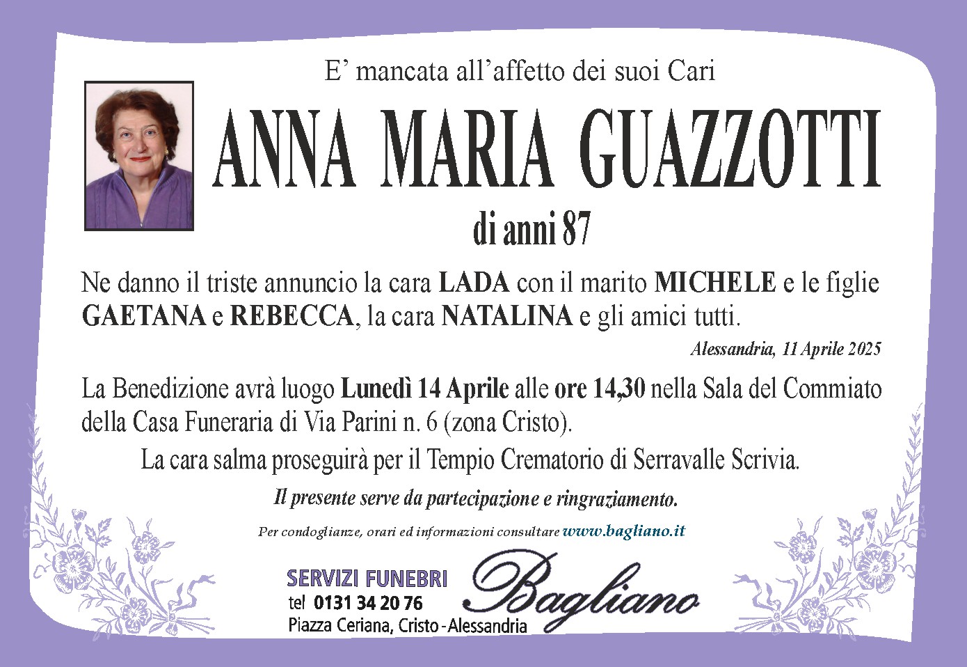 La Benedizione avrà luogo Lunedì 14 Aprile alle ore 14,30 nella Sala del Commiatodella Casa Funeraria di Via Parini n. 6 (zona Cristo).La cara salma proseguirà per il Tempio Crematorio di Serravalle Scrivia.