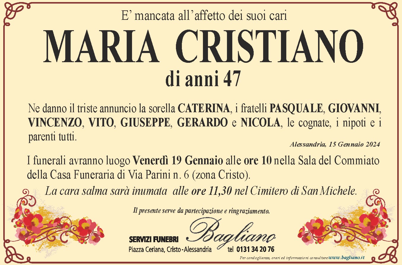 I funerali avranno luogo Venerdì 19 Gennaio alle ore 10 nella Sala del Commiato della Casa Funeraria di Via Parini n. 6 (zona Cristo).La cara salma sarà inumata alle ore 11,30 nel Cimitero di San Michele.