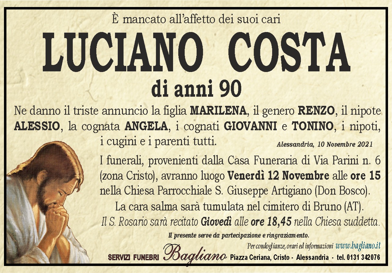 I funerali, provenienti dalla Casa Funeraria di Via Parini n. 6 (zona Cristo), avranno luogo Venerdì 12 Novembre alle ore 15 nella Chiesa Parrocchiale S. Giuseppe Artigiano (Don Bosco).La cara salma sarà tumulata nel cimitero di Bruno (AT).Il S. Rosario sarà recitato Giovedì alle ore 18,45 nella Chiesa suddetta.