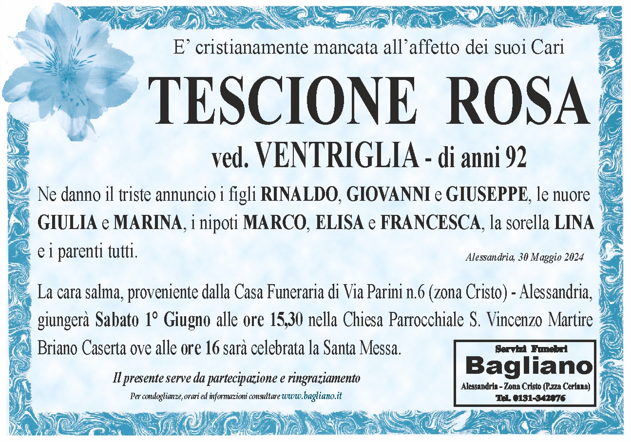 La cara salma, proveniente dalla Casa Funeraria di Via Parini n.6 (zona Cristo) - Alessandria,giungerà Sabato 1° Giugno alle ore 15,30 nella Chiesa Parrocchiale S. Vincenzo MartireBriano Caserta ove alle ore 16 sarà celebrata la Santa Messa.